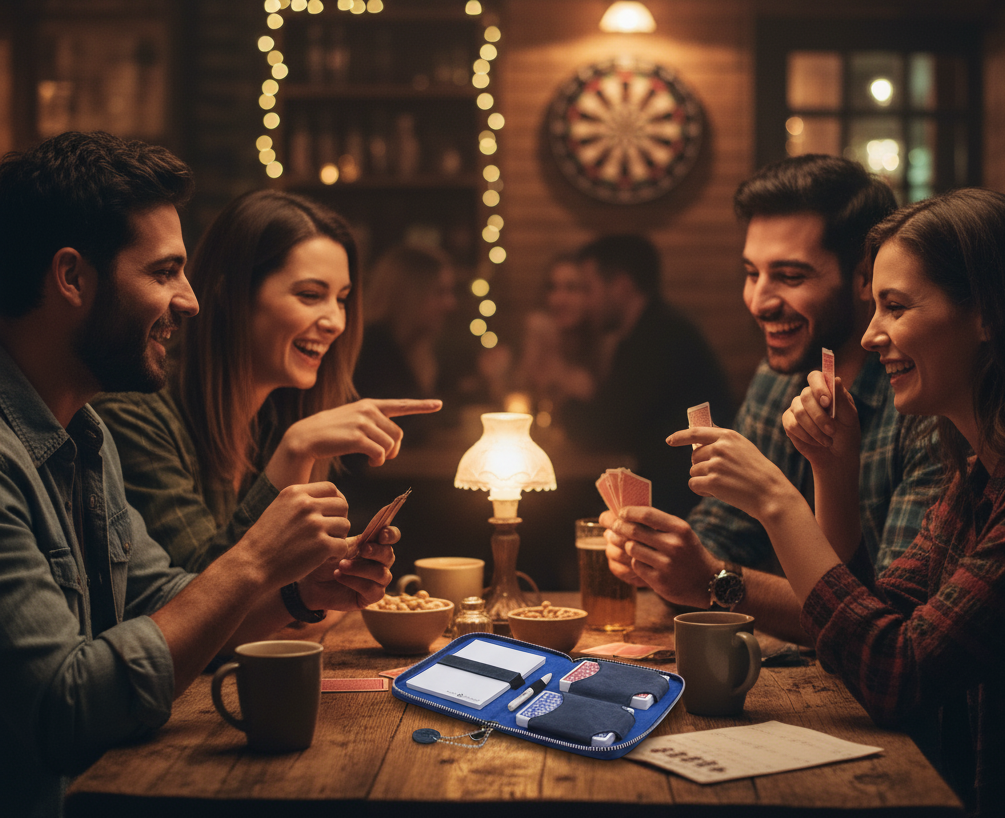 This elegant leather case combines several highlights in one: an exclusive card case, a beautiful set of playing cards, a notepad, and a pencil. It includes a classic two-deck rummy set - also perfect for Skat, Poker, Doppelkopf - or simply as a gift for discerning card lovers.