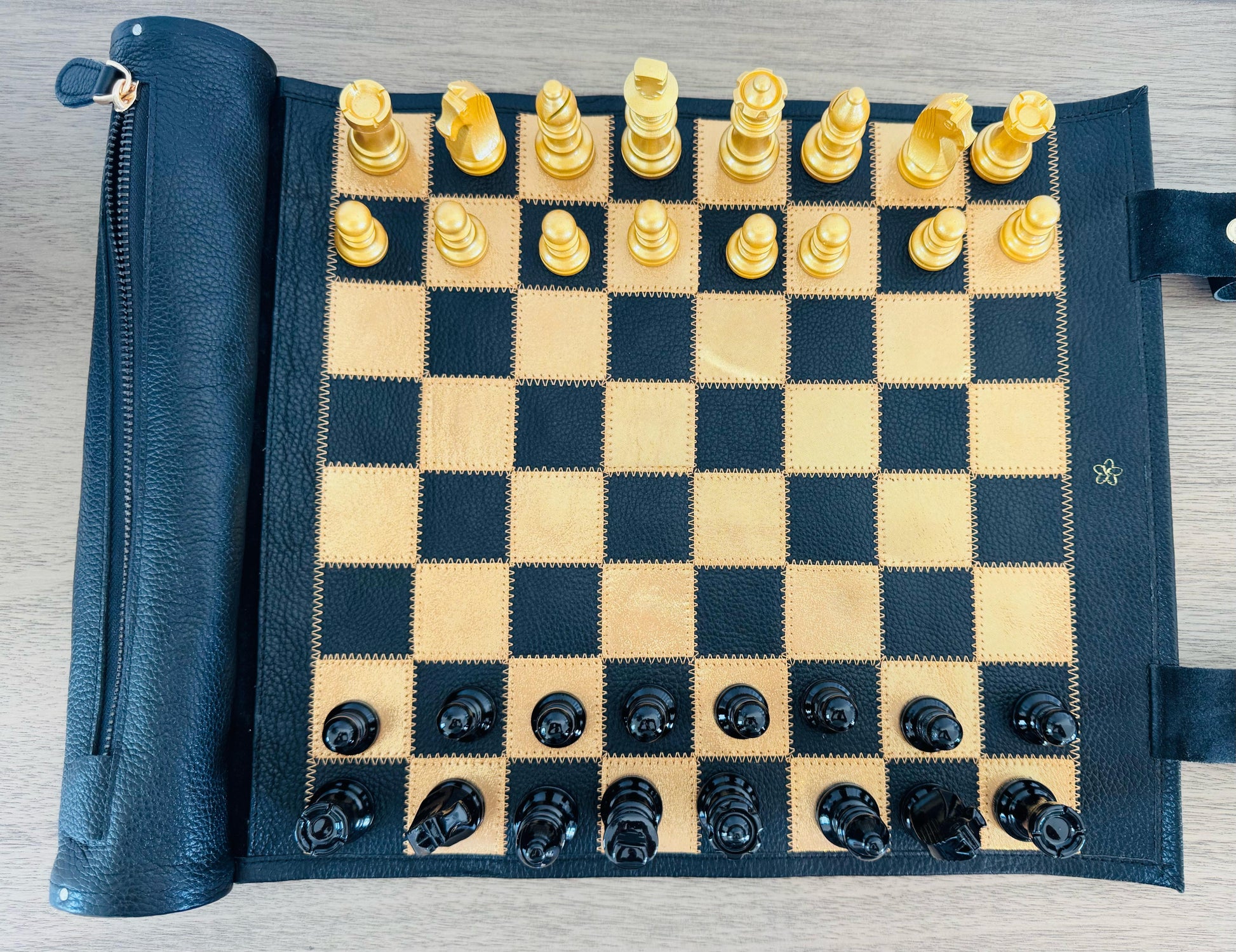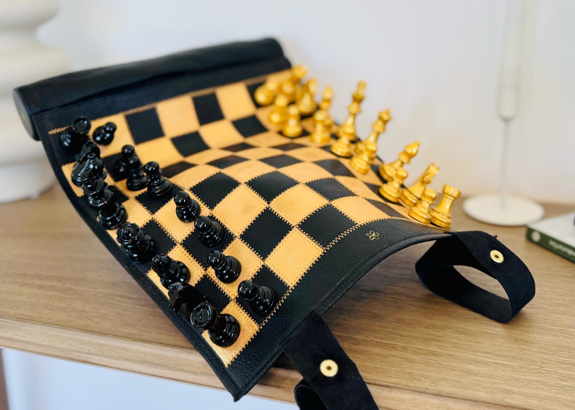 - Rollable chessboard made of high-quality genuine leather – stylish & space-saving